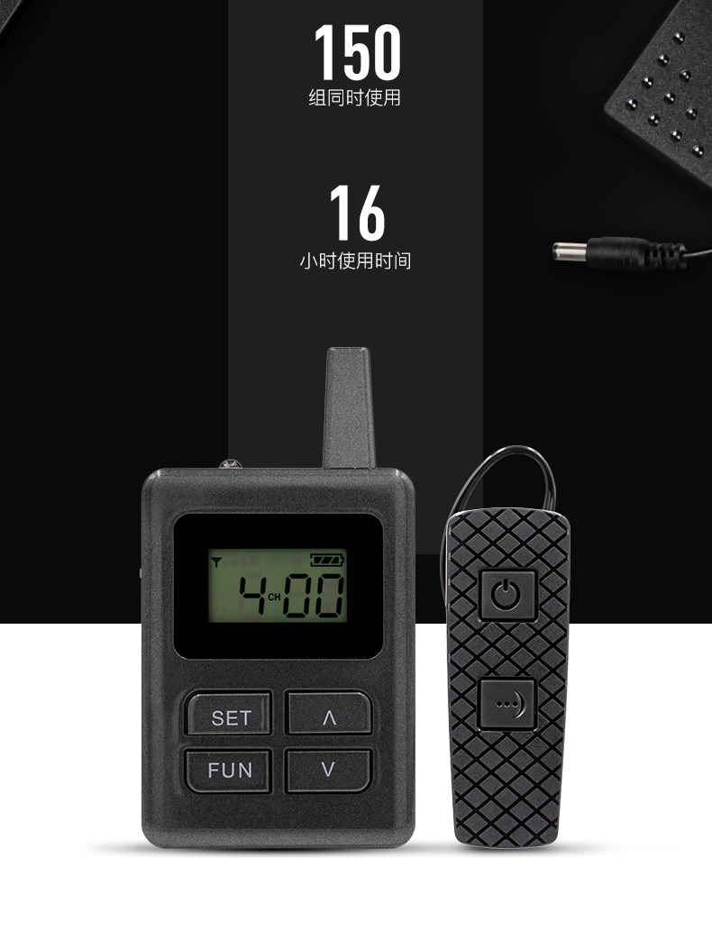 我們的無線講解器由發(fā)射器、接收器、充電箱三部分組成。發(fā)射器和接收器旁邊都設計多個按鈕。 首先,發(fā)射器第一個鍵為開關機鍵,我們只需設備左側一鍵開機即可。 發(fā)射器正面長按set并按開機鍵,即可進入對頻模式。這時再把接收機開機,即可正常對上頻。(開機不分先后,可先開啟接收器進行配對,也可后開啟),開機后,就可以直接自動進行匹配。 充電航空箱,當設備放滿時,直接直接按下開關鍵就可進行充電。充電時自動開啟紫光燈滅菌和負氧離子除味。 |
